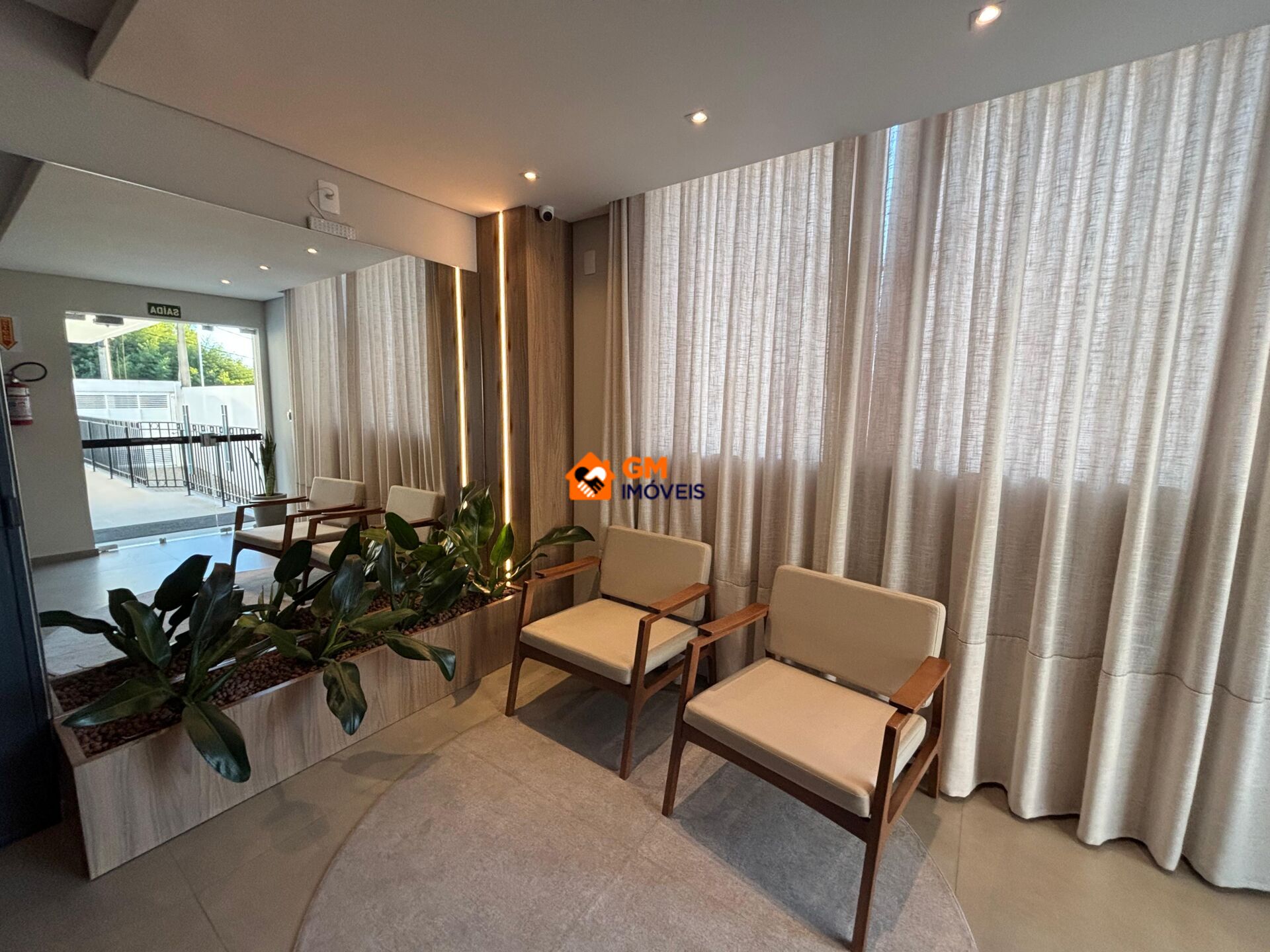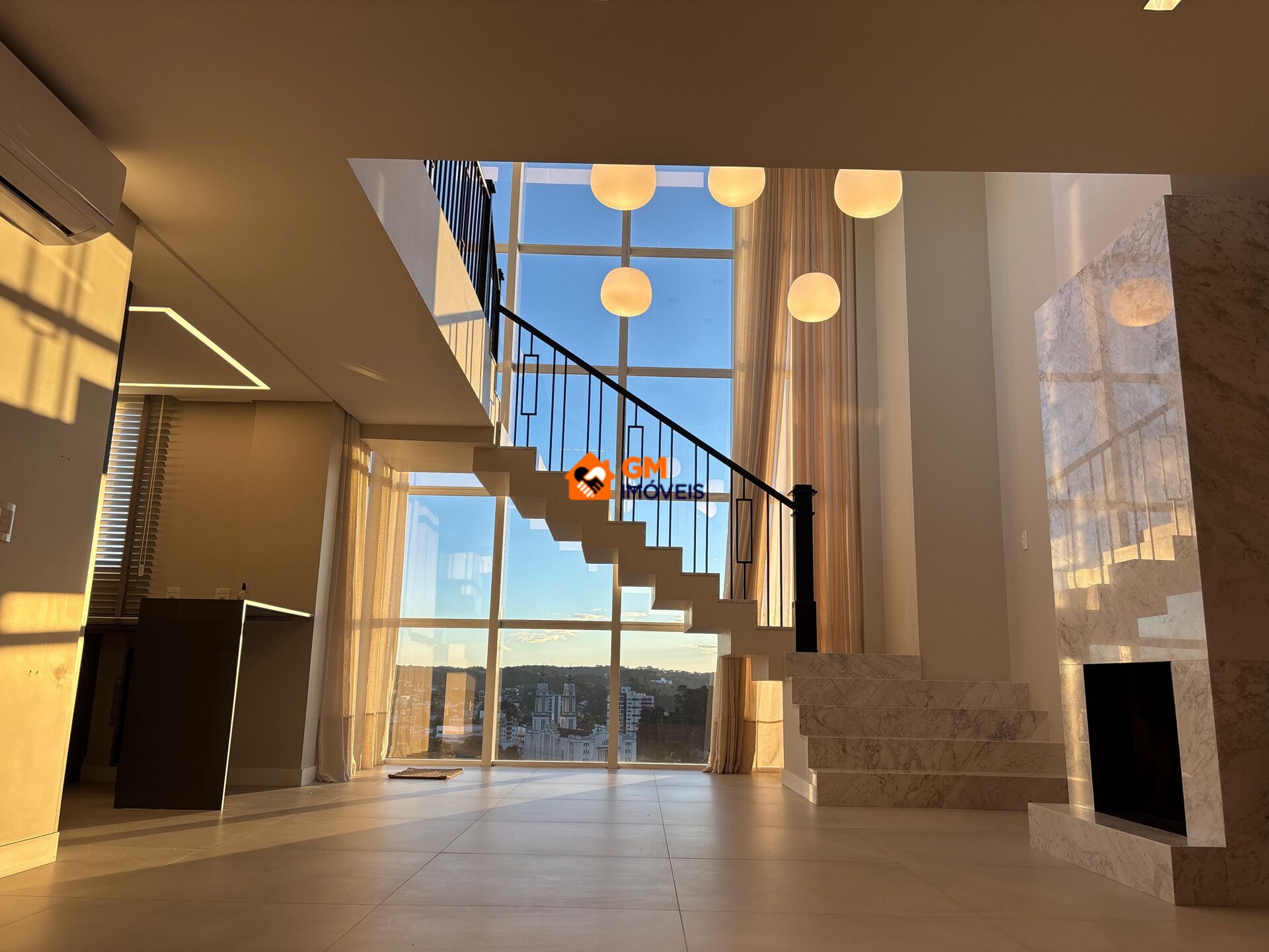 - Sala com pé-direito duplo, iluminação indireta e painéis em mármore;
